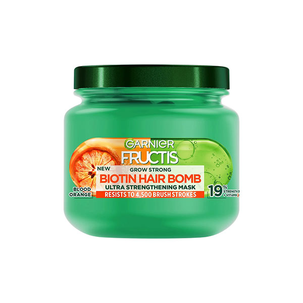 ماسک موی گارنیر Biotin Hair Bomb از مجموعه‌ی قدرتمند Garnier Fructis Grow Strong طراحی شده تا موهای ضعیف، شکننده و آسیب‌دیده را بازسازی کند.